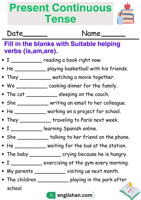 Worksheets On Present Continuous Tense. Next, students are presented with six pictures of students doing things. The worksheet includes examples of present continuous in affirmative, negative and question forms.